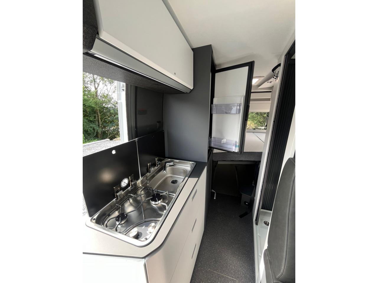 Cuisine avec réchaud deux feux, évier et plaque de protection en verre