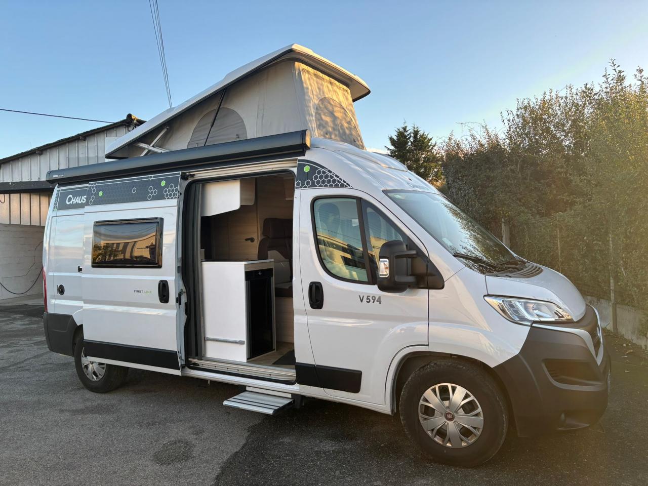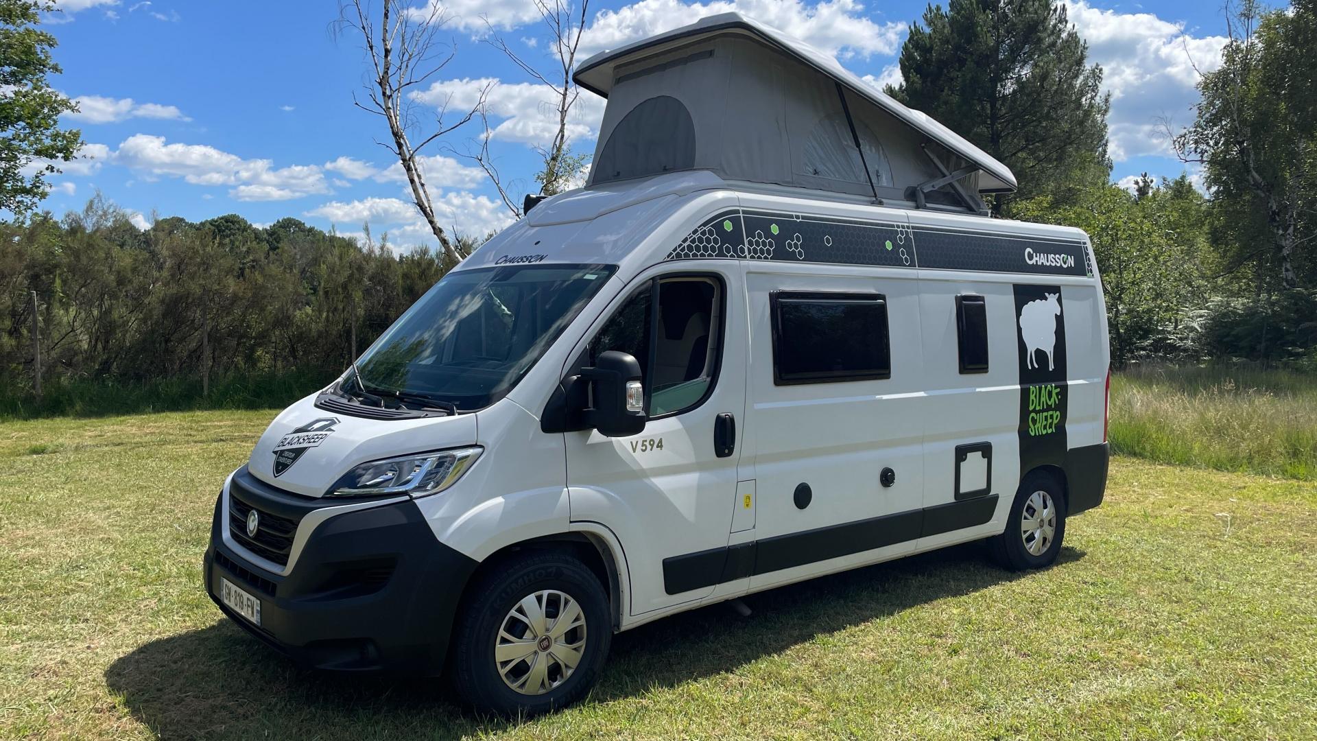 Le modèle V594 de chez Chausson est parfait pour de longs road trips. Ce fourgon aménagé offre un espace de vie très confortable avec son toit relevable qui permet de se tenir debout. Très bien équipé avec ses 4 couchages (2 lits doubles dont 1 dans le toit relevable), sa douche chaude et ses WC intérieurs, il est parfait pour les familles ou 4 adultes.