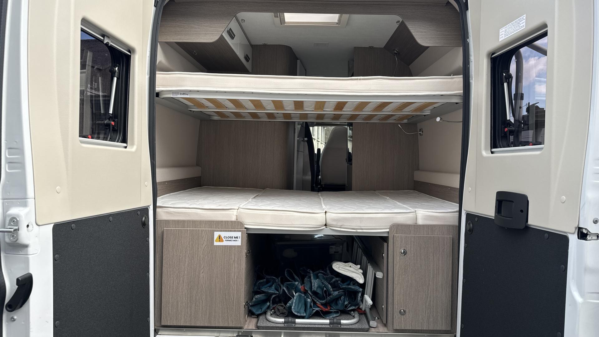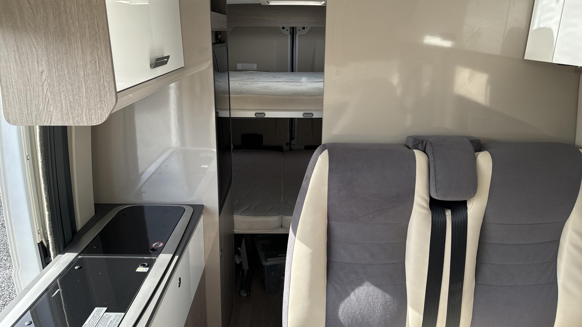 Le Challenger Vany est le compagnon idéal pour de longs road trips car ce fourgon aménagé offre un très bel espace de vie à bord où on peut se tenir debout. Son agencement très complet avec l'espace cuisine, 4 couchages (2 lits doubles superposés), sa douche chaude intégrée et ses WC intérieurs, en font un fourgon extrêmement confortable.